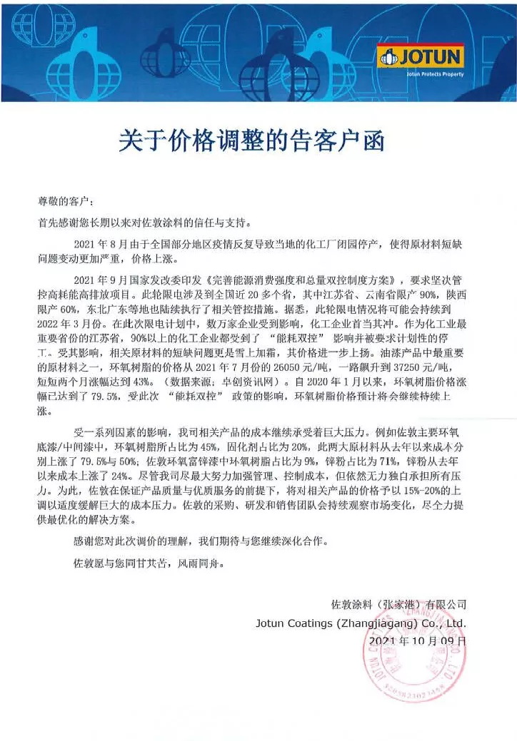 受一系列因素的影響,我司相關(guān)產(chǎn)品的成本繼續(xù)承受著巨大壓力。例如佐敦主要環(huán)氧底漆/中間漆中,環(huán)氧樹脂所占比為45%,固化劑占比為20%,此兩大原材料從去年以來成本分別上漲了79.5%與50%;佐敦環(huán)氧富鋅漆中環(huán)氧樹脂占比為9%,鋅粉占比為71%,鋅粉從去年以來成本上漲了24%。盡管我司盡最大努力加強管理、控制成本,但依然無力獨自承擔所有壓力。為此,佐敦在保證產(chǎn)品質(zhì)量與優(yōu)質(zhì)服務(wù)的前提下,將對相關(guān)產(chǎn)品的價格予以15%-20%的上調(diào)以適度緩解巨大的成本壓力。佐敦的采購、研發(fā)和銷售團隊會持續(xù)觀察市場變化,盡全力提供最優(yōu)化的解決方案。