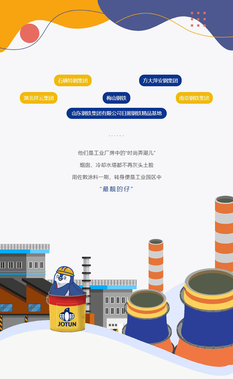 佐敦涂料攜手在業(yè)內(nèi)擁有超過30年高空施工經(jīng)驗的施工團隊,為各類正在轉(zhuǎn)型的鋼鐵企業(yè)提供維修、防腐、美化服務(wù)。佐敦為此類美化服務(wù)提供專業(yè)的油漆配套,鋼廠美化專用的高性能涂料體系,不僅可以配合施工隊的快速施工,而且調(diào)色方便、調(diào)色空間大,能基于環(huán)保的基礎(chǔ)上更方便、精準地展現(xiàn)出業(yè)主及設(shè)計師的設(shè)計理念。